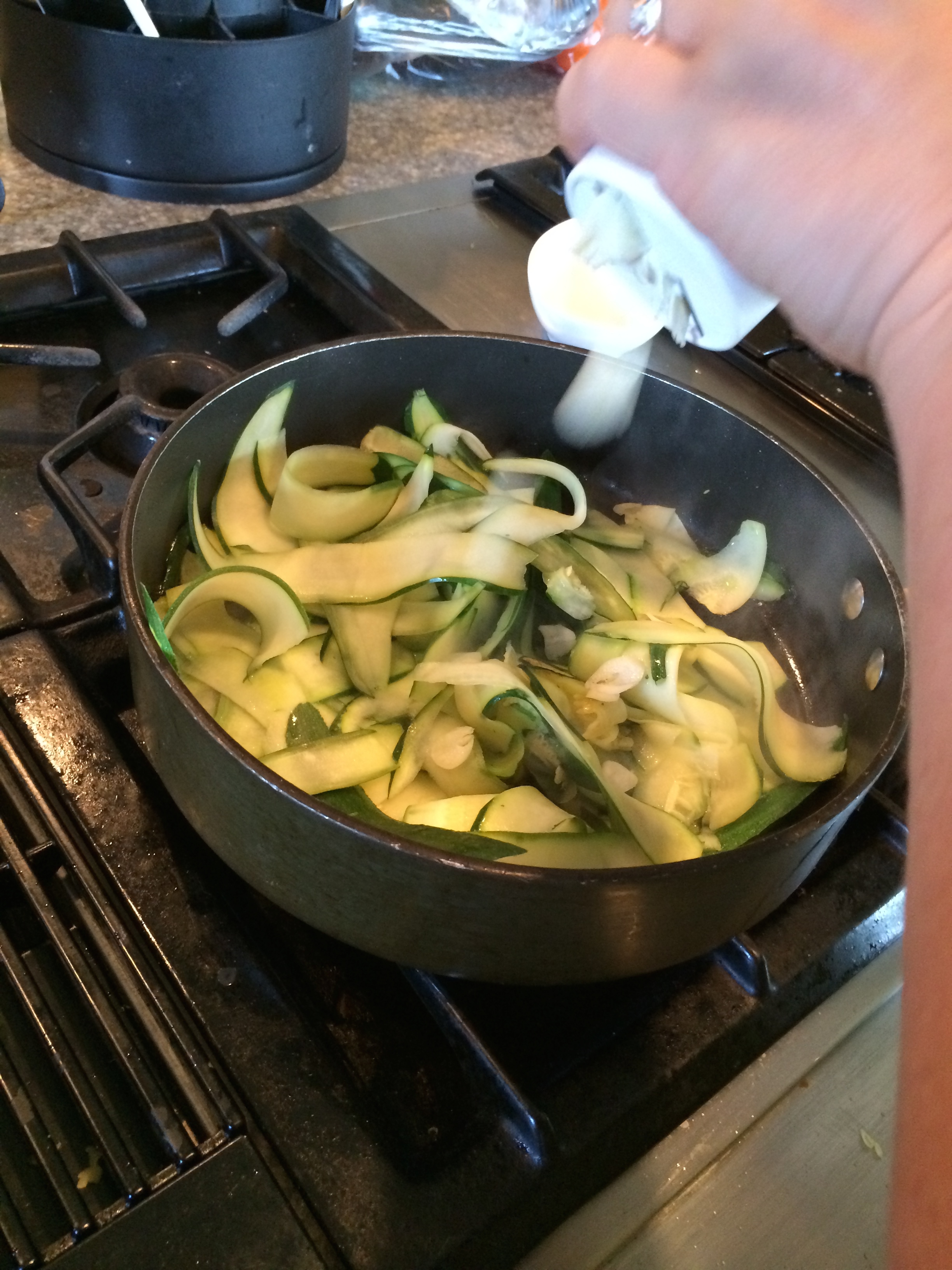 This is so stinking easy to make and it tasted great. I just drained the crab meat and added it to a bowl along with all those other ingredients (except the mozzarella – that went last.) I mixed it all up — probably using about 1/2 teaspoon or so of each of the spices… but of course, I do everything to taste. Stuffed the portobellos by patting the mixture inside the cap and put all four of them into my big old wrought iron pan. Added about a cup of white wine to the pan. Put it in an oven heated to 400 and let it go for 20 minutes. Then I added a slice of mozzarella cheese to each and let that continue to cook for another 5 -10 minutes. In the meantime — I had a few zucchini in the fridge. My absolute favorite way to eat zucchini these days is also probably the simplest preparation of all. I washed them and cut off the ends. Using my basic vegetable peeler — I peeled ribbons of the squash right into a hot pan that had a bit of olive oil in it. Then I shaved some fresh garlic into the same pan and added a few pinches of salt. It only takes a few minutes of tossing these thin ribbons around to cook them. I’ve served this with pesto sauce, with red sauce, with cooked tomatoes — and always a little shaved cheese on top. This tastes like pasta to me and is so much healthier for you, you can’t go wrong. The whole dinner took me about 1/2 hour to prepare and get on the table. Not bad, eh?
